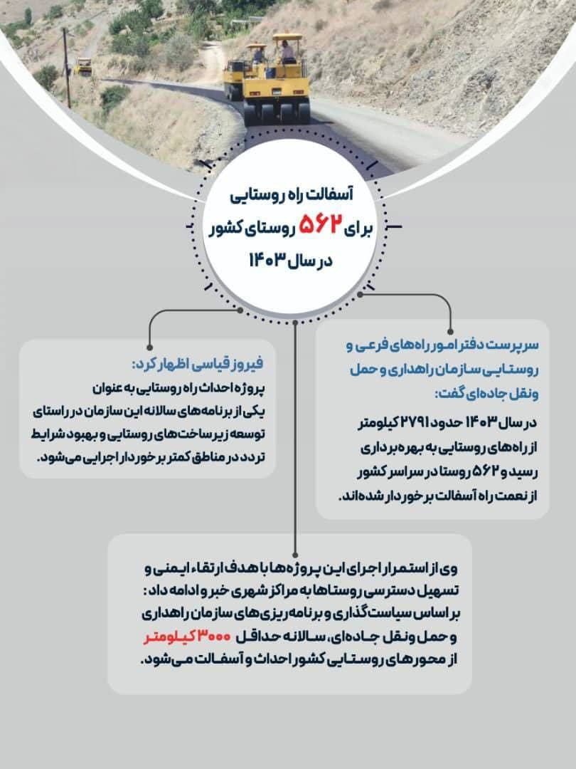 آسفالت راه روستایی برای ۵۶۲ روستای کشور در سال ۱۴۰۳ اصلی راهساز 1404/02/21 آسفالت راه روستایی برای ۵۶۲ روستای کشور در سال ۱۴۰۳