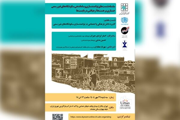 این نشست سهشنبه ۲۹ مهر ۱۴۰۴ با همکاری کمیته ملی اسکان بشر، پژوهشکده سوانح طبیعی و کارگروه انسان شناسی شهری دانشگاه تهران در قالب کمپین جهانی اکتبر شهری (Urban October) برگزار میشود.